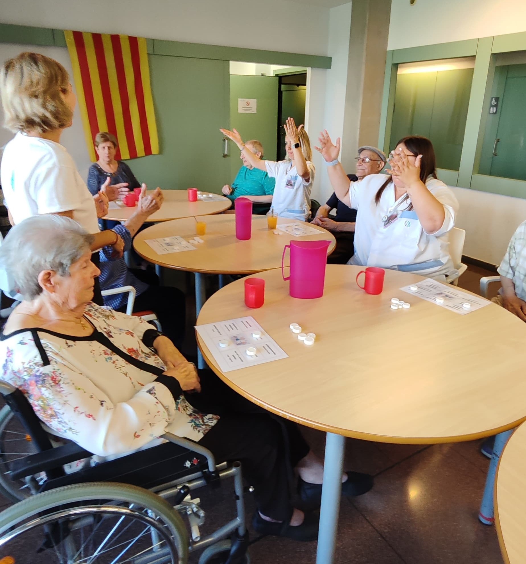 Descarregar PdfEls residents de Balàfia II participant en el Bingo Musical. L'activitat va combinar la música i el joc per estimular la memòria i fomentar la hidratació, dos aspectes clau per a la salut i el benestar de les persones grans.