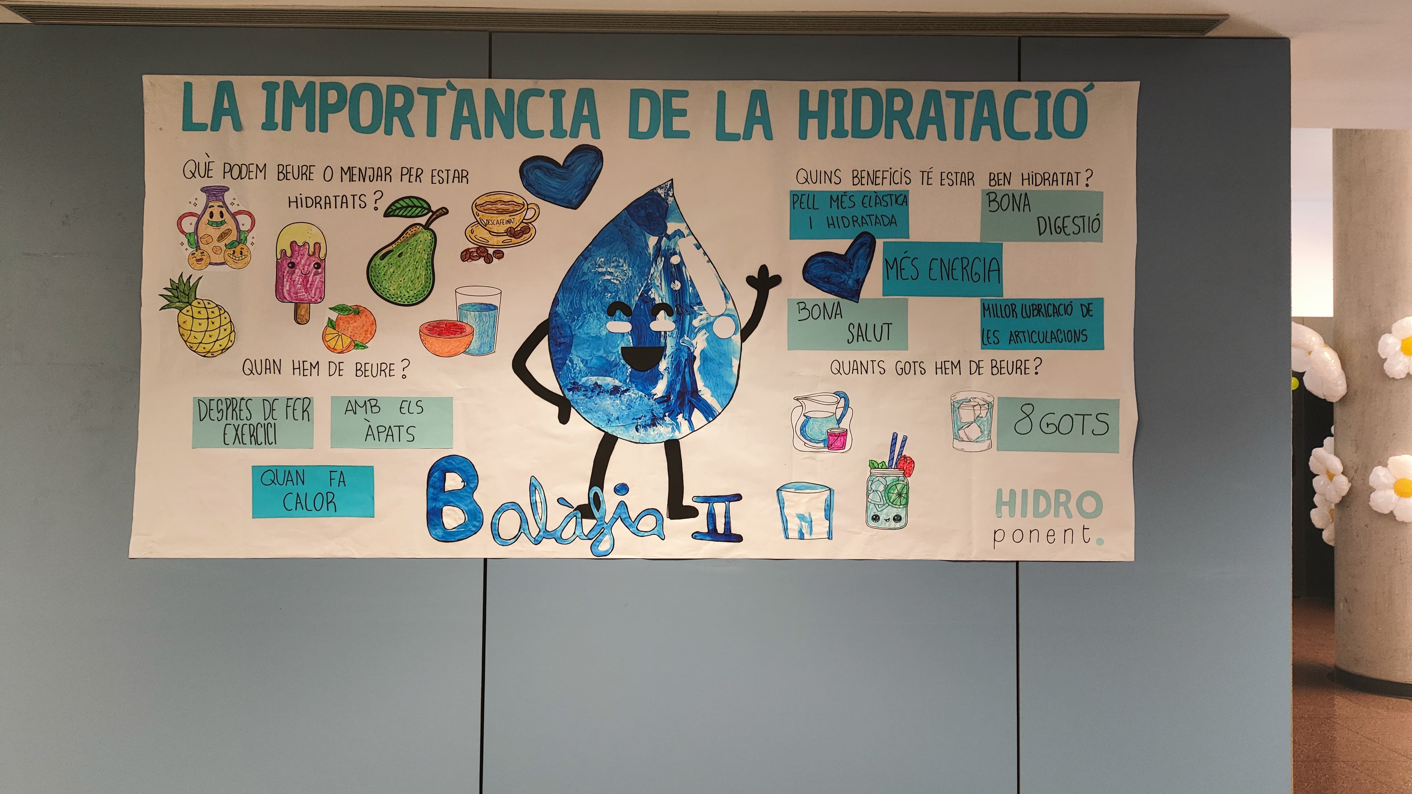 El mural de la hidratació, penjat a l'entrada de la residència Balafia II, està dissenyat per educar i conscienciar els residents sobre aspectes crucials de la hidratació. El mural aborda qüestions com què podem beure o menjar per estar hidratats, quins beneficis té estar ben hidratat, quan hem de beure i quants gots hem de beure al dia. Aquestes preguntes es treballen mitjançant vídeos educatius reproduïts pel robot Temi, expressió artística amb colors relacionats amb l'aigua i música sobre la hidratació i dibuixos amb ceres que representen aliments i begudes hidratants.